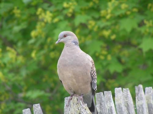 Горлица кольчатая немного крупнее – вес достигает 200 граммов. Отличается черным кольцом на шее. Предпочитает держаться у сельскохозяйственных угодий и населенных пунктов. Селится крупными колониями.